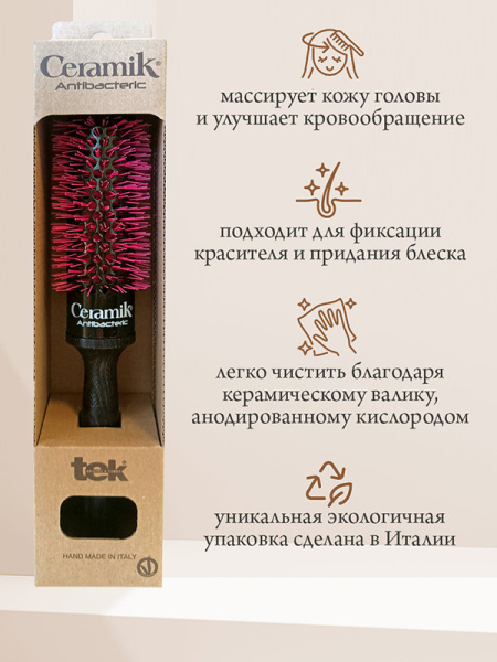 Профессиональная щетка Tek с антибактериальной розовой щетиной и основанием, обработанным кислородом. Идеальна для быстрой сушки волос. Снимает электризацию. Подходит для фиксации красителя и придания блеска. Уникальная экологичная упаковка изготовлена в Италии. Древесина сертифицирована FSC.