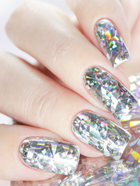 3. Отрывными движениями приклеивать фольгу к поверхности ногтя или его части – цвет перейдет на ноготь. Можно использовать фольгу одного цвета или нескольких разных.