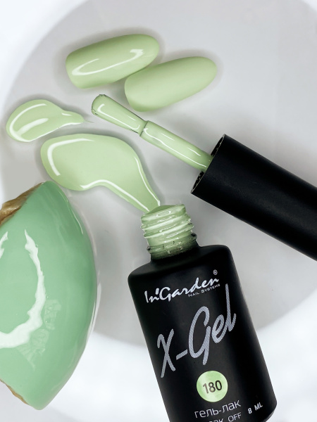 In’Garden X-gel № 180 оттенок « Фисташковый пломбир»: эмаль на основе белого цвета, с освещающей зелёной нотой