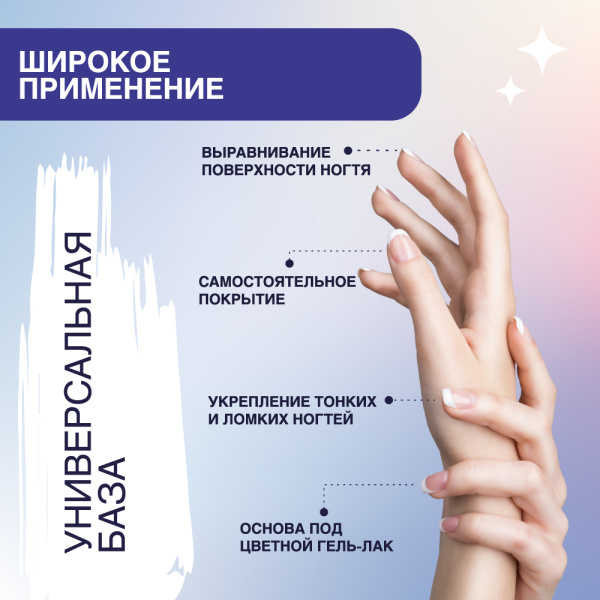 Эластичная камуфлирующая каучуковая база выравнивает ногтевую пластину и создает отличное сцепление. За счет плотной консистенции укрепляет ногти и защищает их от механических повреждений. Молочный, нежный, натуральный оттенок идеально подходит под френч.