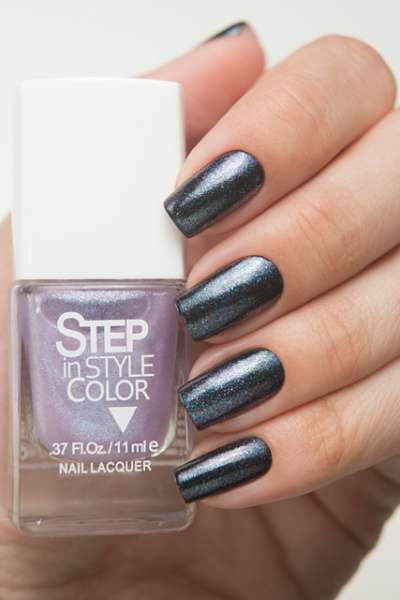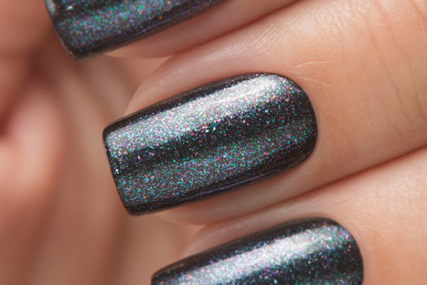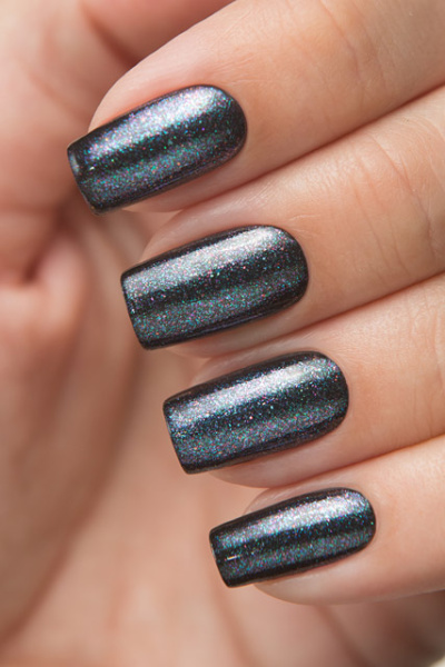 Топовое покрытие имеет прозрачную основу, едва подкрашенную фиолетовым. Этот оттенок заметен только во флаконе. Шиммерное наполнение топа очень разнообразное: в нём присутствует переливающийся разным цветом золотые, розовые, голубые, красные и фиолетовые частицы, придающие цветной основе лёгкий металлический отблеск.