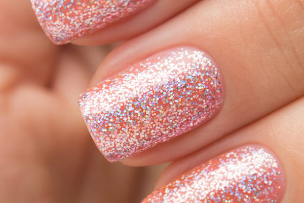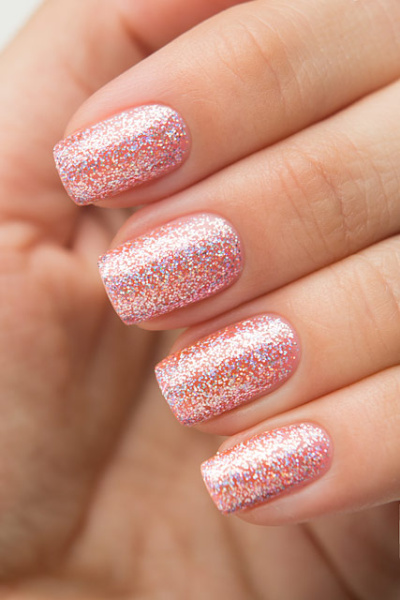 Чуть подкрашенный розовым глиттерный лак с голографическими блёстками разного размера.
