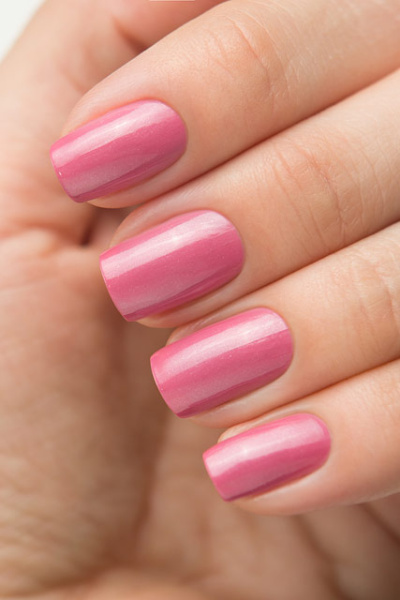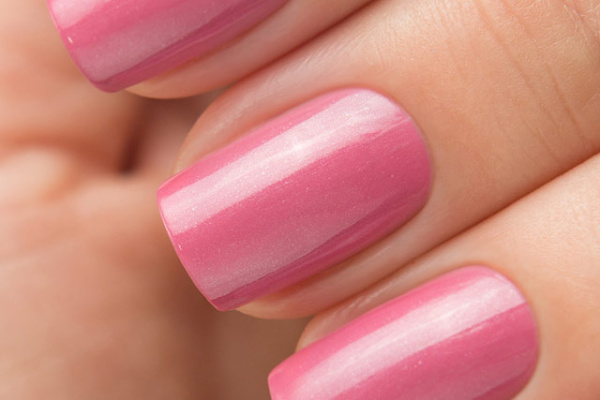 Припылённый розовый крем на белой базе с добавлением серебристого микрошиммера и более крупного голубого, в форме хлопьев.