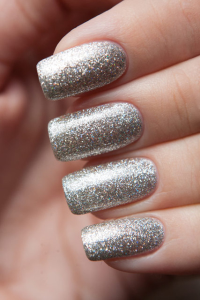 База лака имеет едва уловимый лиловый оттенок и содержит в себе серебряный и голографический глиттер.