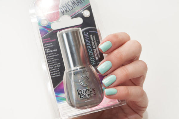 Декоративный топ представляет собой прозрачный топ с большим количеством мелкого голографического пигмента, благодаря которому при нанесении поверх другого лака покрытие превращается в линейный голографик.