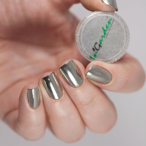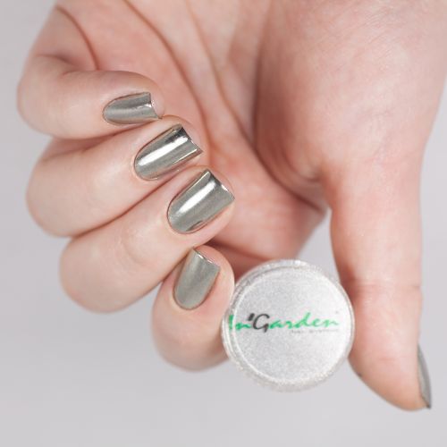 При использовании втирки In’Garden на поверхности ногтя создается поверхность с хромовым блеском, имитирующим зеркало. В зависимости от концентрации, цвета и сочетания основы и втирки Вы сможете получить благородное мерцание или гламурный сияющий цвет.